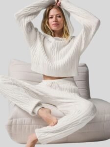 Cozy textures meet chic design in this cable knit hoodie—perfect for cold-weather parties and holiday gatherings.